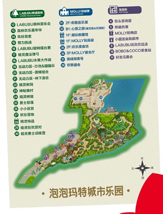 从乐园项目来看,泡泡玛特乐园室内项目为“MOLLY的城堡”,第一层是MOLLY的玩具展、手工坊和潮玩收藏馆项目,二三层则主要是餐饮区。室外项目里,主要有围绕LABUBU打造奇遇森林主题,以及融合互动、游戏与购物的泡泡街。
