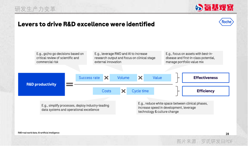 这或许正是其不断调整管线的核心原因。眼下,罗氏正在探索研发生产力的转型变革。在研发日上,其表示将从有效性、效率层面提高其研发生产力。