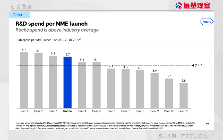 产品研发费用方面,2018年-2022年期间,罗氏每个NME(新分子实体)研发费用平均为57亿美元,高于平均水平47亿美元。