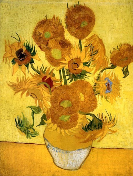 金黄色依然是占绝对比例。背景是黄色,向日葵的花也是黄色,但我们第一眼依然能够注意到这些颇有点“宁死不屈”感觉的向日葵。生活中其实我们很少见到这么多支向日葵花插在瓶子里的样子,看起来都快成熟了,恐怕一般人也不会去折断他们吧?但我想说的是,他们放在瓶子里怎么那么的有力量啊!真实的样子会有那么强烈吗?还是梵高故意把他们画的那么张狂?如果有机会的话,我真的想采几只,插在家里的瓶子里看看到底是什么样子?梵高还有一幅《鸢尾花》,只不过花是蓝色的,给人的感受很相似,只是没有这个强烈。我觉得这幅画我们能感受这么多就已经够了。