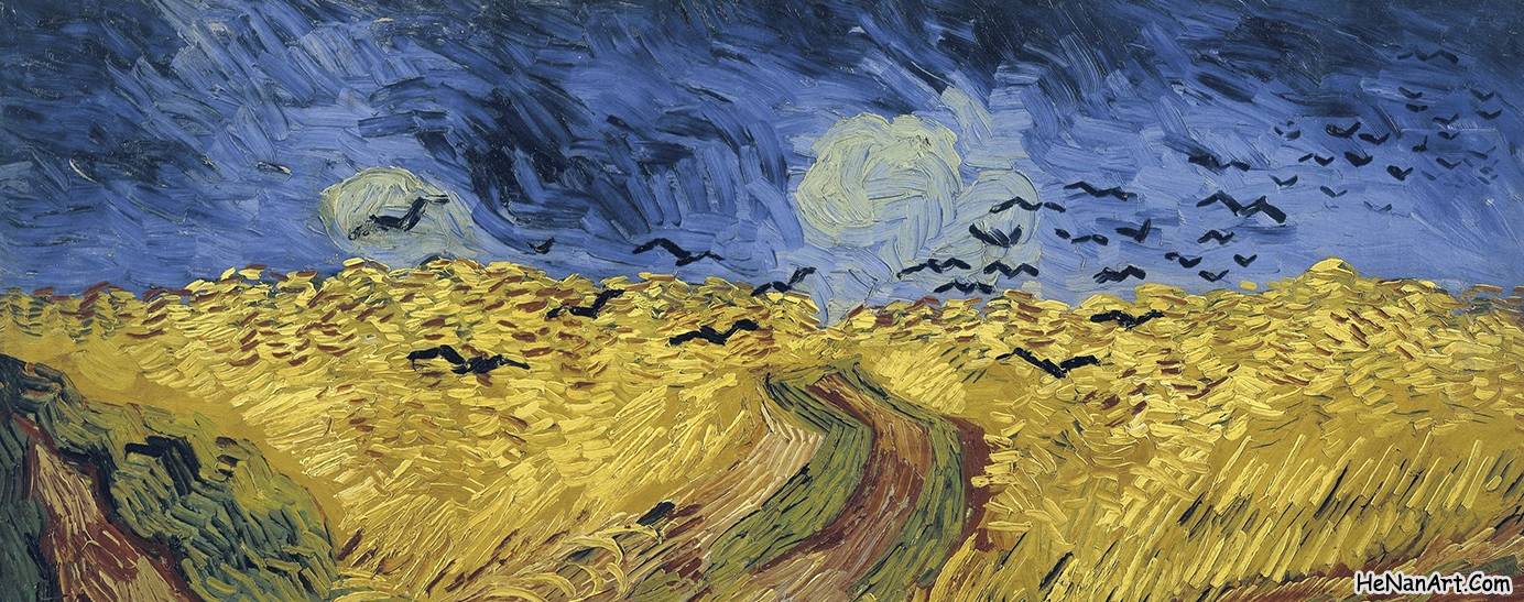 注意到了吧?仍然是金黄色占大面积,然后是蓝色。你看这幅画的时候感觉到压抑了吗?尽管麦田是金灿灿的黄,但天空很低,要下雨的样子,有种透不过气的感觉。麦田看的有点不清不楚的,路很宽,但也不清晰,恍恍惚惚的。麦田上方有一群大概被人惊飞的乌鸦。我是不想在这个环境中呆很久,还是赶紧逃离吧。不知道有人经历过这种压抑的状态没有,那是一种有点难受,想让人吐的感觉。