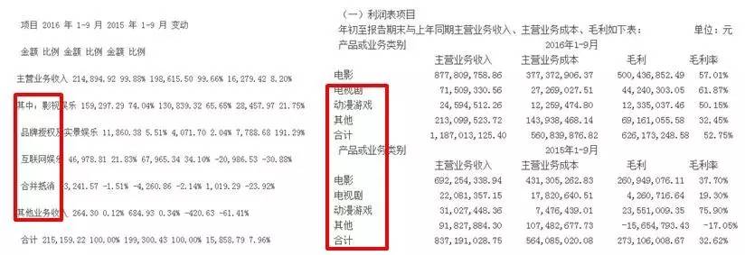 华谊(左)及光线(右)2016Q3主营业务收入明细