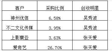 据悉,今年上半年,喜天影视的五大客户分别为北京爱奇艺科技有限公司、神州优车信息技术公司、新沂明邑影视文化工作室、不二文化传媒、上影寰亚,而其主要创收却主要集中于吴秀波和张天爱两位明星。一旦捆绑松动,喜天的业绩极可能受到重创。