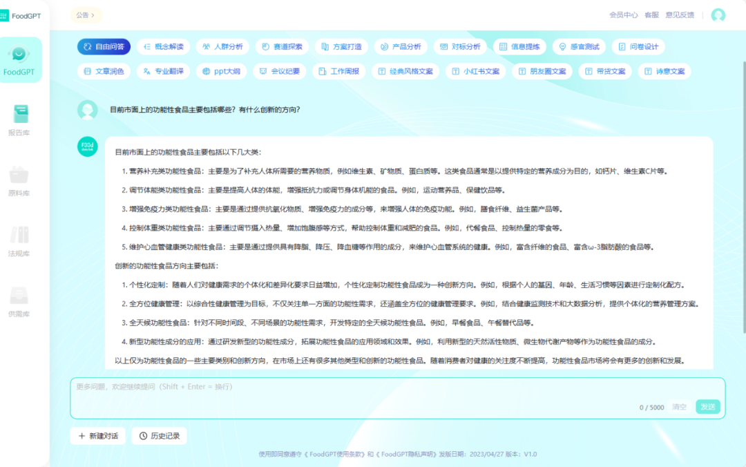 在产品选择上,相比于保健食品,目前国家对于功能性食品还没有明确其在法律中的地位,即使其概念宣传中不能使用带有特定功效的词语,但因其性价比更高且形态、成分更多元化,已成为当下消费者口中的“香饽饽”。在健脑功能食品中,根据FoodGPT的解释,常见的功能创新产品主要包含益生菌食品、代餐食品、运动营养品、功能性果蔬汁等。