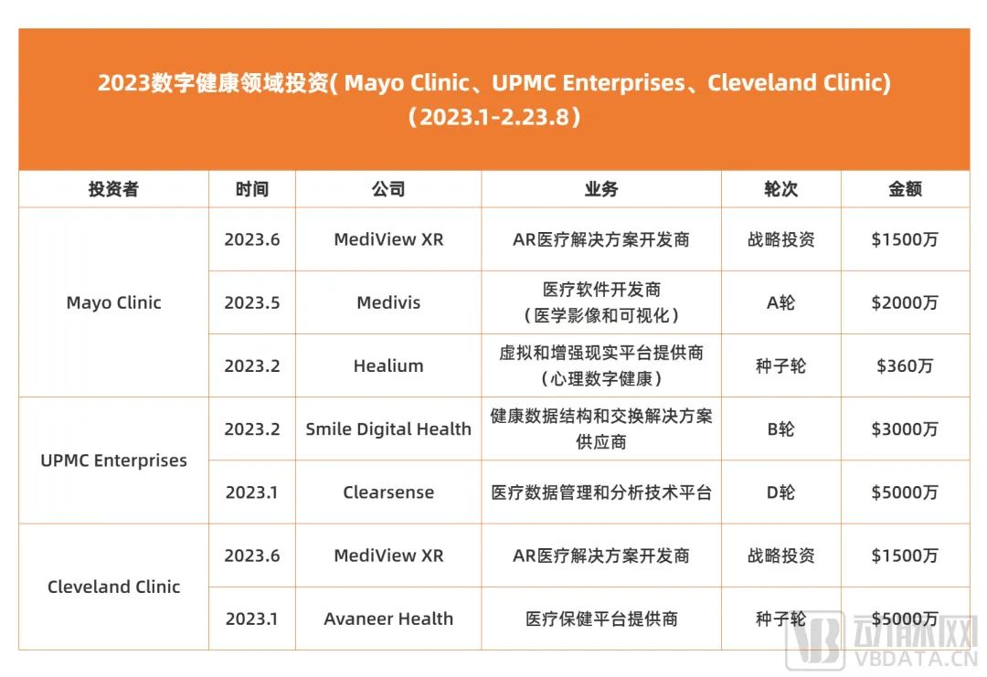 在今年7笔数字健康融资中,Smile Digital Health为UPMC长期复投项目,其A、B轮UPMC都是主要投资者。而Mayo Clinic对MediView XR投资前,在2023年1月就官宣与MediView XR合作。根据合作协议条款,MediView XR将向MediView提供临床、技术和研究专长。