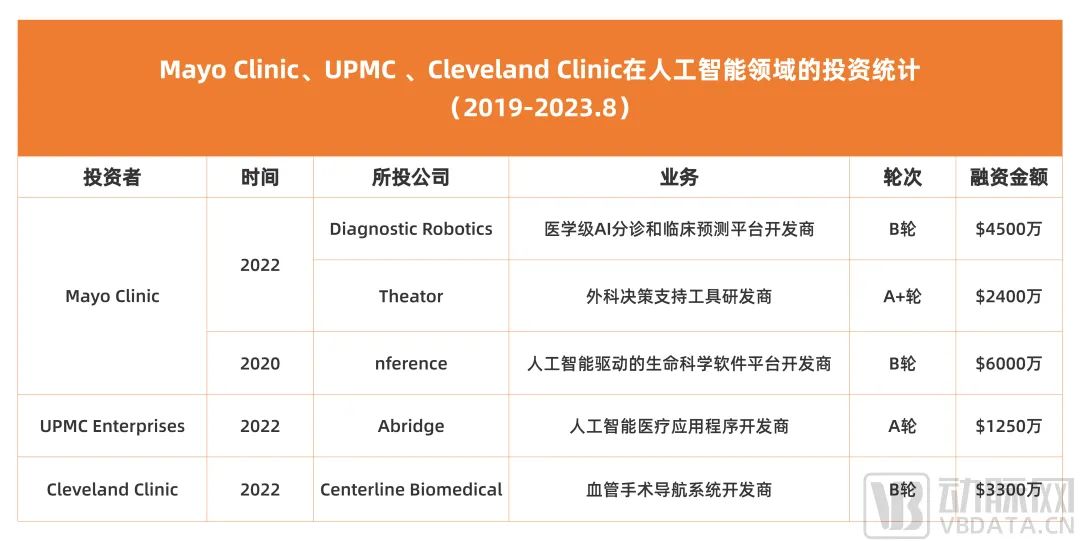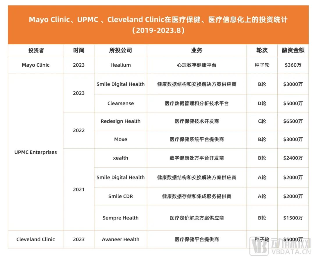 2023年前8个月,三家医院共有4笔相关投资。其中,UPMC是医疗信息化投资的大户,Mayo Clinic、Cleveland Clinic今年上半年增加了对该领域的投资。