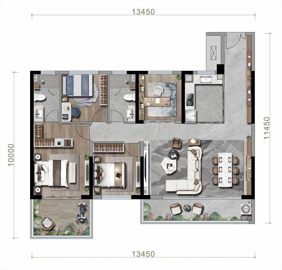建面约143㎡四居室产品,在北向多出一间书房,同时完全实现了宽幕横厅的设计,拥有超大观景台,大气、空间感十足。