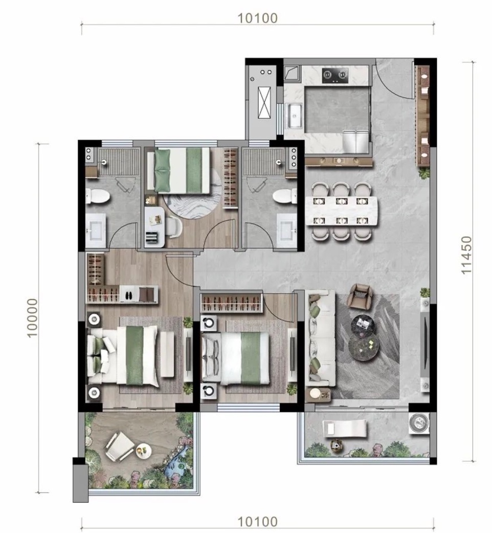 其中,建面约115㎡三居室,双卧室+客厅三面朝南,采光面大;露台+阳台双倍赠送,空间利用率较高;建面约126㎡三居室可以看做是各个空间加大版的115㎡户型产品,更大,舒适度更高。