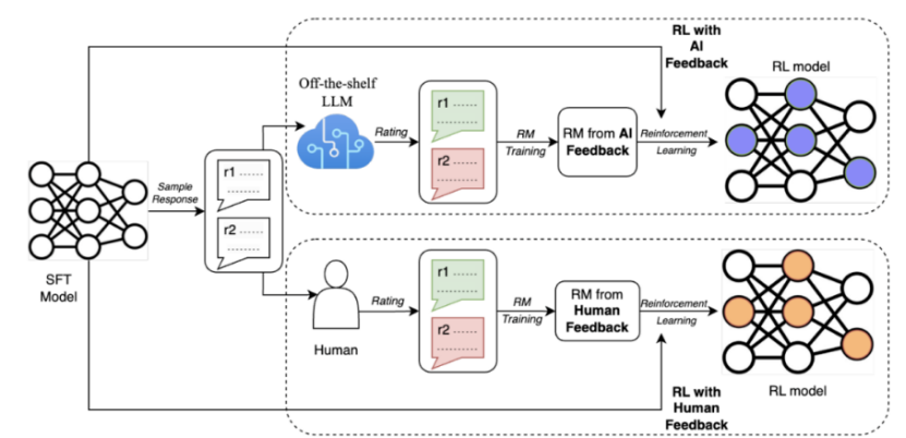 为了解决这些问题,谷歌最近提出了一种用大模型替代人类进行偏好标注的方法,称为AI反馈强化学习(RLAIF)。