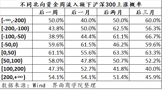 从历史数据来看,北向资金2016年7月以来单周净流入均值为50.03亿元。当北向资金净流入位于均值附近区间时,沪深300指数同样上涨的概率较高,尤其是净流入在50亿之内的区间时,沪深300指数后一周、后一个月、后两个月以及后三个月上涨概率均显著增加。