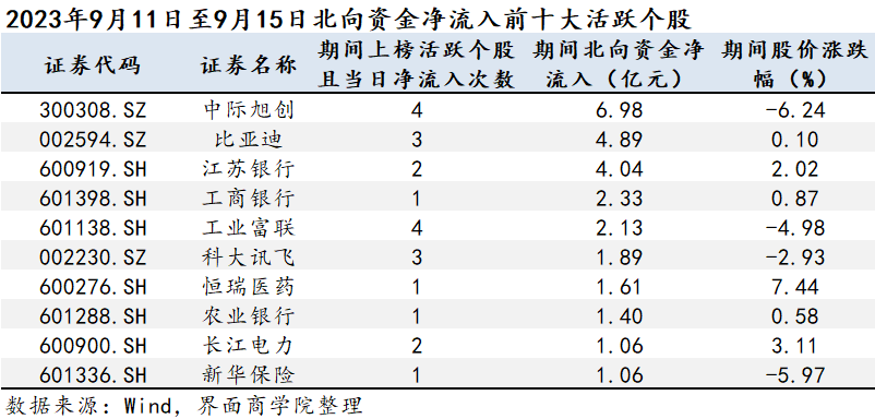 从北向资金活跃个股净流入金额上看,中际旭创(300308.SZ)、比亚迪(002594.SZ)、江苏银行(600919.SH)为9月第二周北向资金净流入的前三。