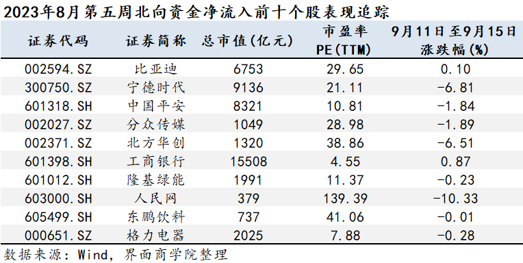 下图为上期2023年8月第五周北向资金净流入前十大个股的后续表现情况。数据截至2023年9月15日,追踪区间为2023年9月11日至9月15日。排序以上期资金净流入为基准。