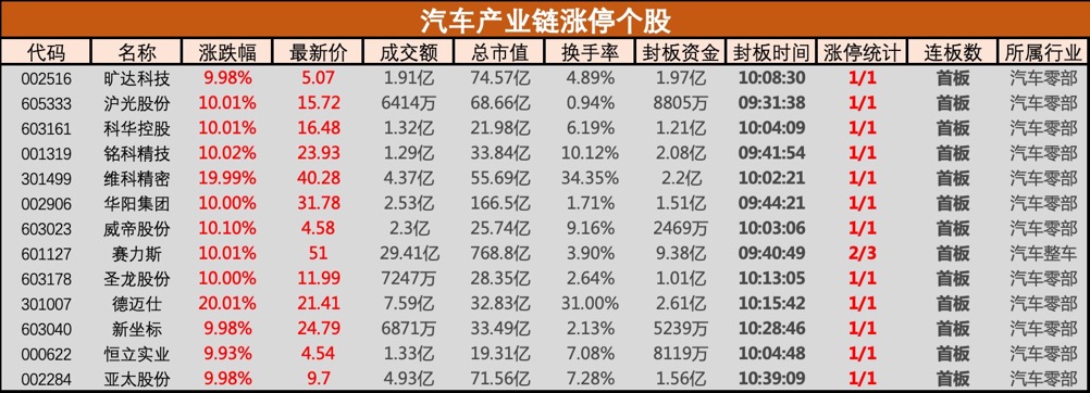 9月18日,汽车产业链集体走强,华为汽车概念股领涨,德迈仕(301007)、赛力斯(601127)、铭科精技(001319)、华阳集团(002906)、维科精密(301499)等超10股涨停。