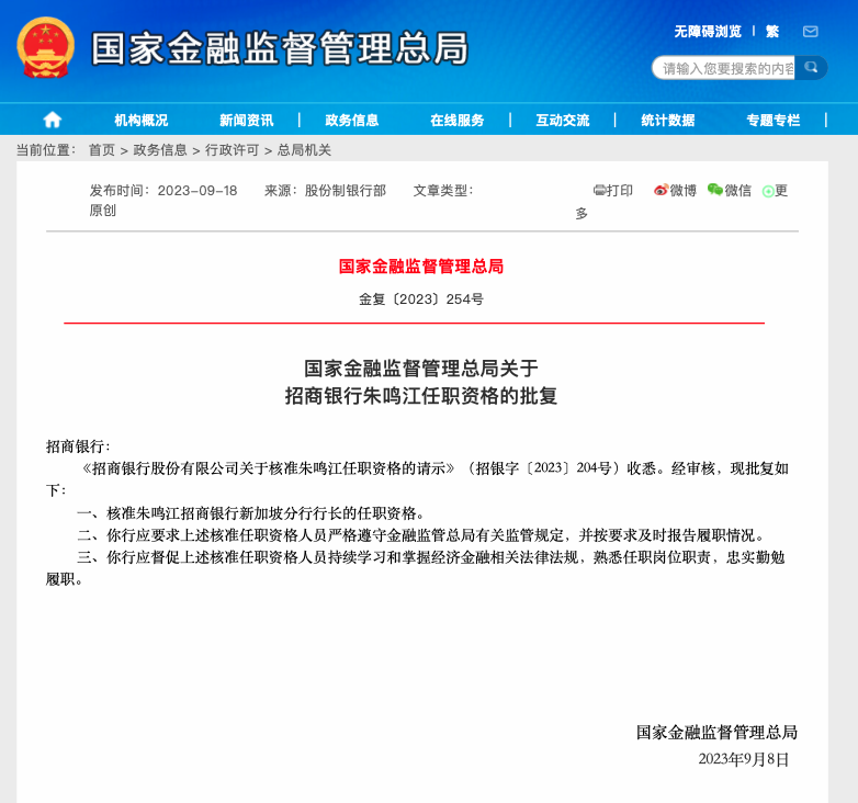 9月18日,国家金融监督管理总局披露关于招商银行朱鸣江任职资格的批复,核准朱鸣江招商银行新加坡分行行长的任职资格。