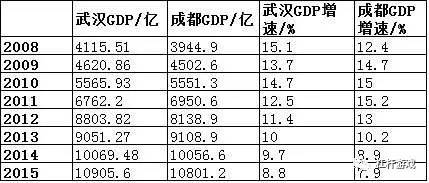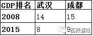 图5.2008年、2015年武汉、成都在全国城市GDP的排名及变化。两个城市绝对位次都很有进步,但相对排序其实没变,经济总量极为接近,制图|张银银,数据来源|网络