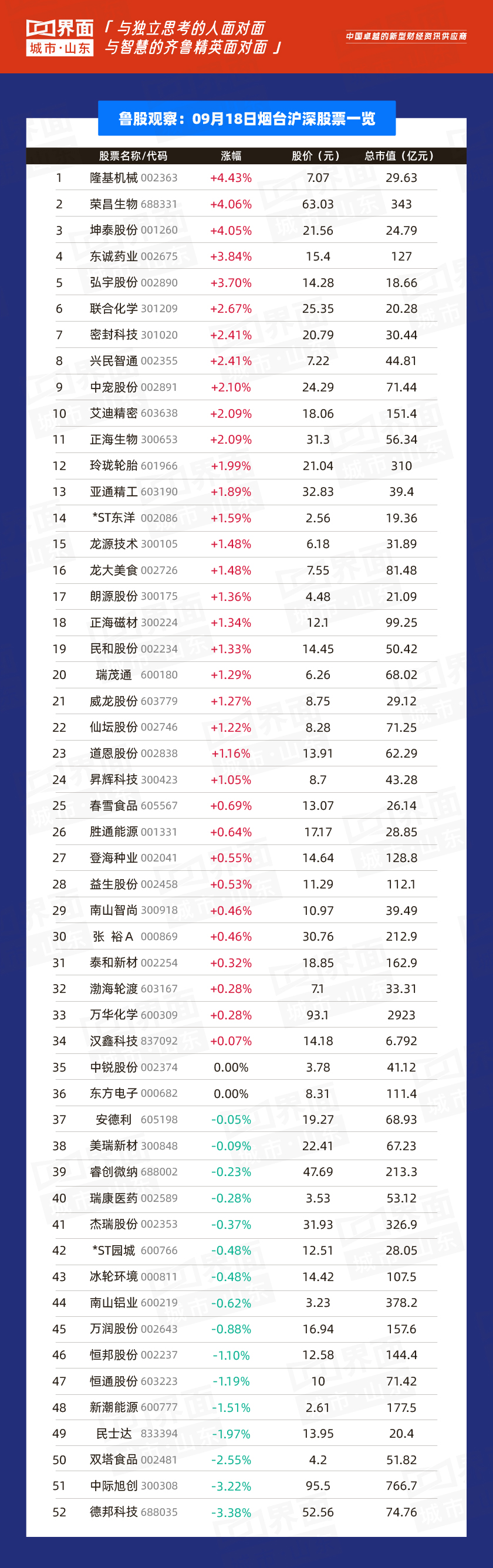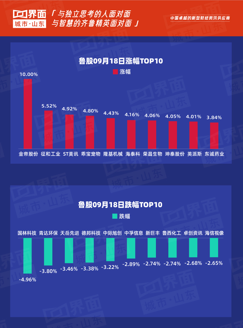 9月18日,山东省内沪深京股票有209只个股上涨,85只个股下跌。