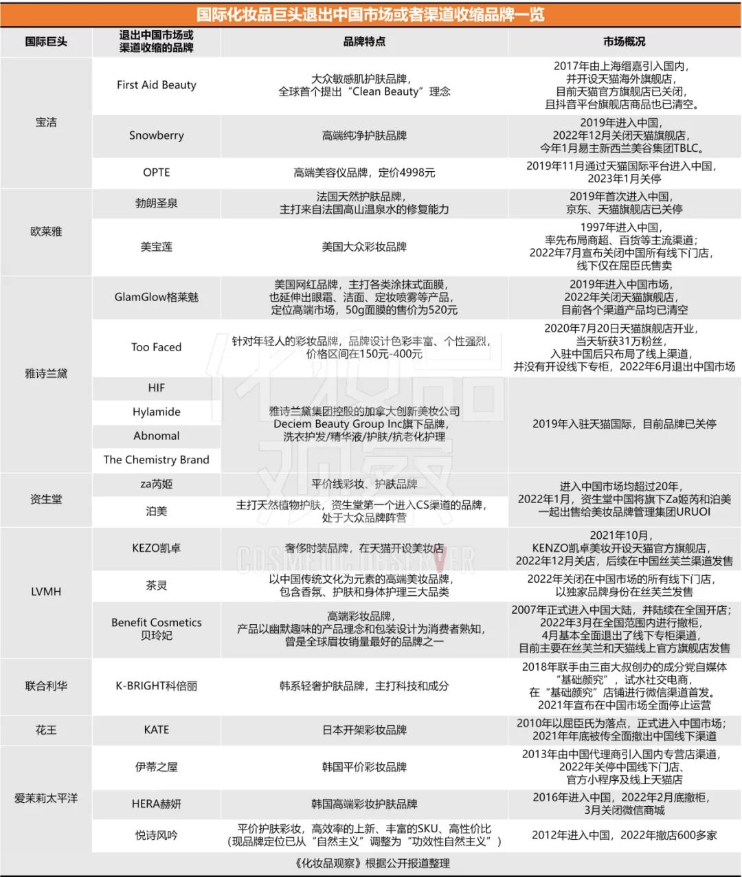 反之,平价品牌在中国遭遇了集体性的败退。在《化妆品观察》梳理的21个退出中国市场或渠道收缩的品牌中,平价大众品牌占比超50%,上演了一场“高端进、平价退”品牌变阵。