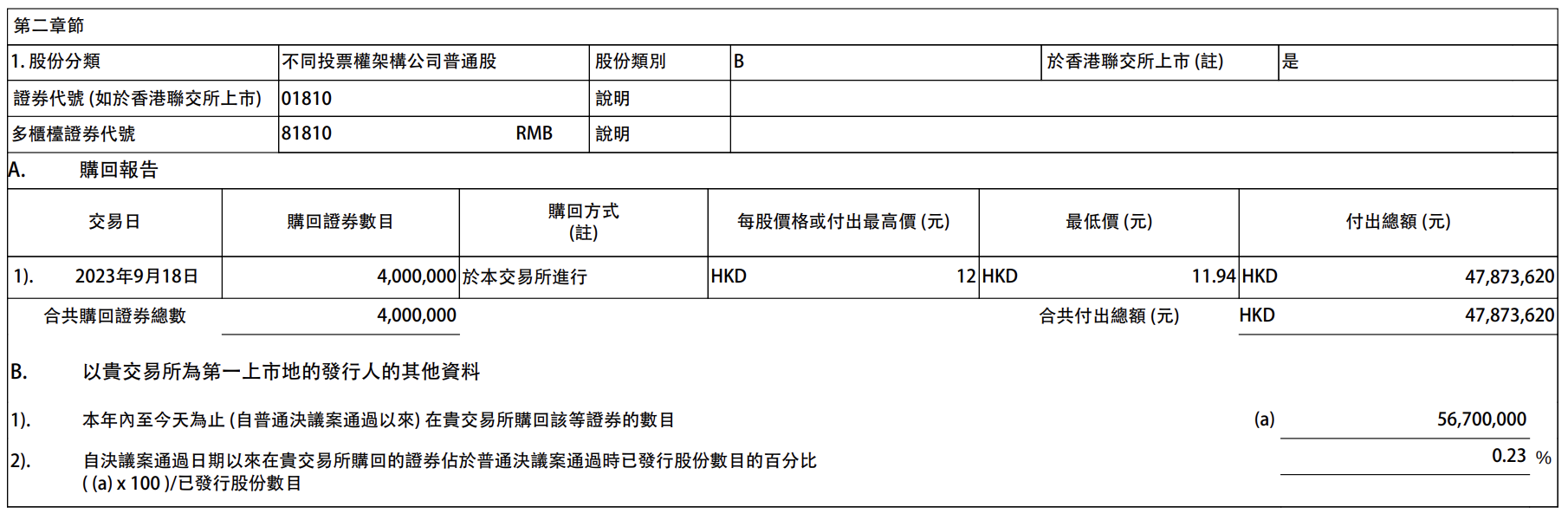 小米集团9月18日在港交所公告,今日耗资约4787.36万港元回购了400万股股份,每股回购价格11.94港元-12港元。