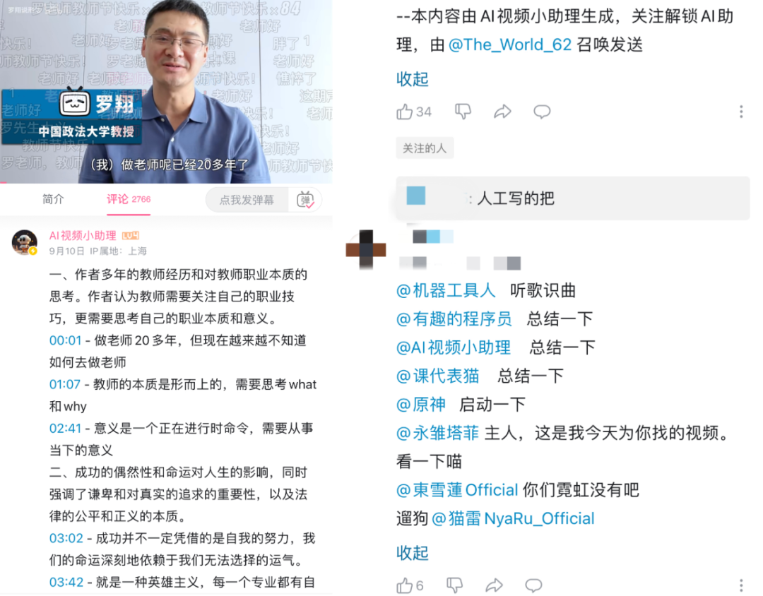 教师节这天,「罗翔说刑法」刚在B站发了一条谈及教师职业意义的视频,只见其评论区「AI视频小助理」详细梳理了其视频要点及跳转时间点,文末则有标识“本内容由XX用户召唤发送”。