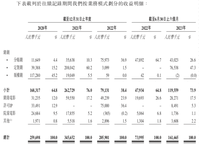 耐看娱乐的招股书显示,其营收主要由网剧、网络电影、许可IP以及院线电影这四大块业务构成,其中网剧及网络电影占据绝对的比重。2020年到2022年,耐看娱乐来自网剧及网络电影的收入占比,分别占总收入的76.8%、93.2%、62.3%,2023年上半年的占比更是达到了91.4%。
