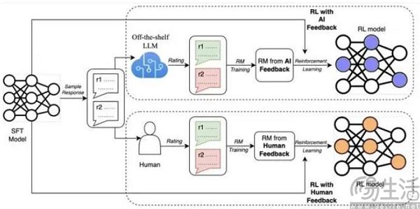 日前,Google Research的最新研究提出了AI反馈强化学习(RLAIF),用来代替基于人类反馈的强化学习(RLHF)。事实上,RLHF正是ChatGPT等同类产品表现出比Siri等上一代人工智能产品更聪明,表达更接近人类的关键驱动因素之一,它可以借助人类反馈信号来直接优化语言模型,数据标注人员则通过给大模型产出的结果打分,由他们来负责判断大模型生成的文本是否优质(迎合人类偏好)。