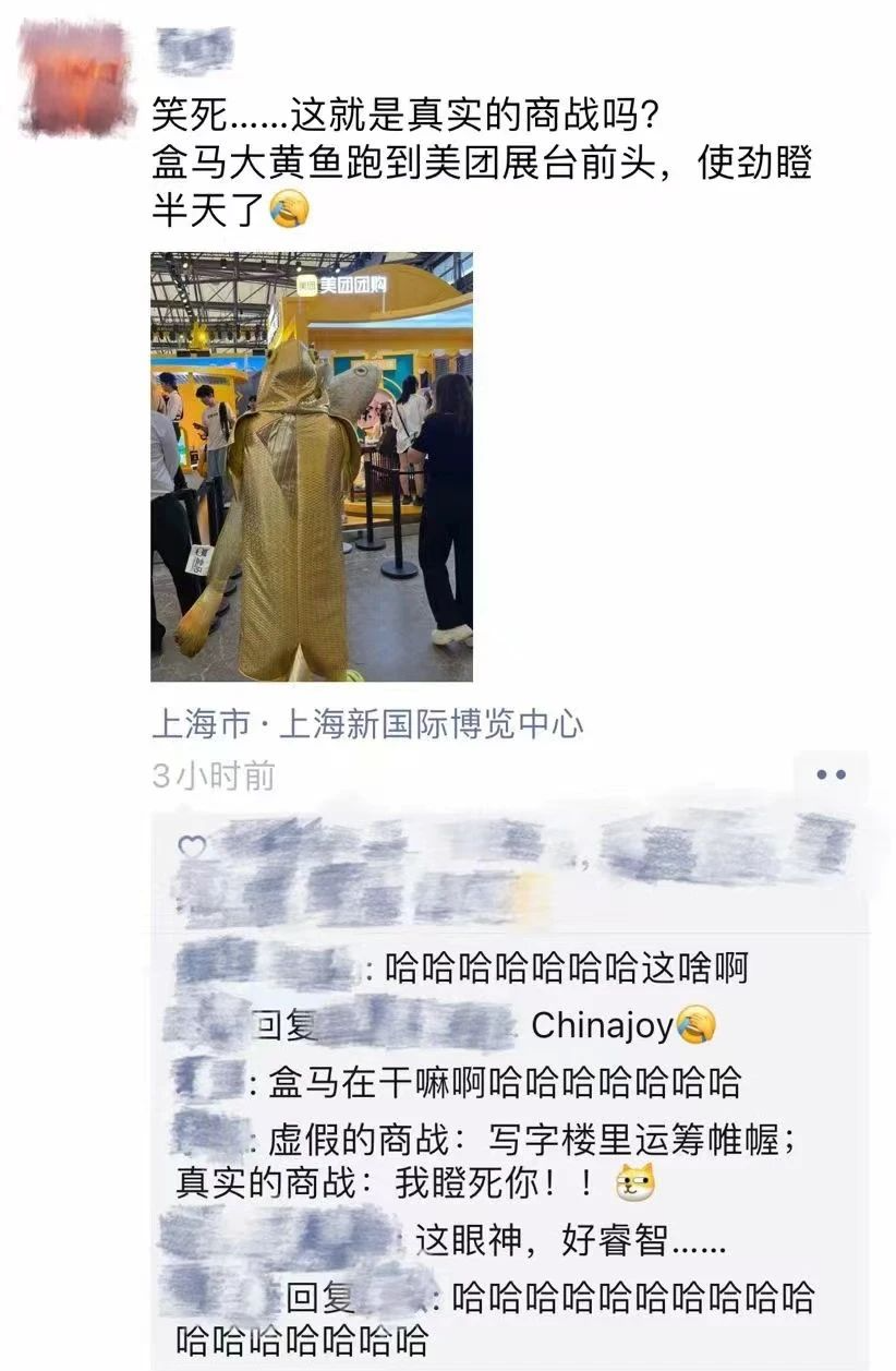 就在不久前7月底的ChinaJoy展会上,盒马护卫队的大黄鱼就跑到了美团展台,旁若无人般使劲瞪了美团老半天,立马成为了人群中的“显眼包”,然后美团的袋鼠在展会上逮到盒马就直接回瞪反弹,在社交媒体的造梗传播下就成了:虚假的商战——写字楼里运筹帷幄;真实的商战——我瞪死你!二者同时出圈。