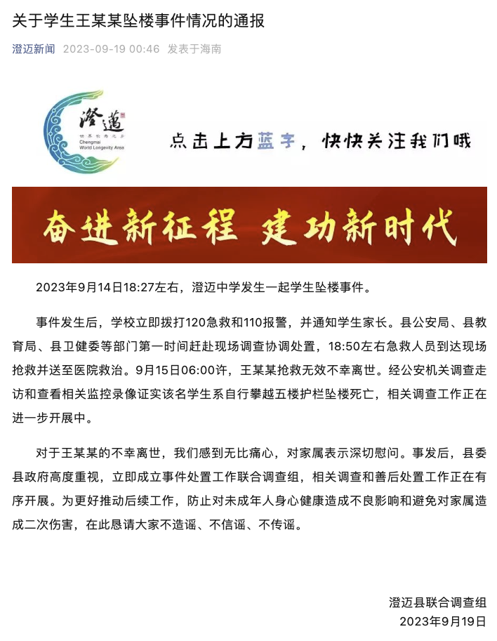 据澄迈新闻,9月19日,海南澄迈县通报,9月14日18:27左右,澄迈中学发生一起学生坠楼事件。事件发生后,学校立即拨打120急救和110报警,并通知学生家长。县公安局、县教育局、县卫健委等部门第一时间赶赴现场调查协调处置,18:50左右急救人员到达现场抢救并送至医院救治。9月15日06:00许,王某某抢救无效不幸离世。经公安机关调查走访和查看相关监控录像证实该名学生系自行攀越五楼护栏坠楼死亡,相关调查工作正在进一步开展中。