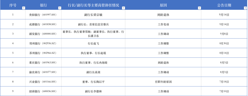今年7月份以来A股上市银行行长/副行长等主要高管辞任情况。资料来源:公告,时代财经/制表。