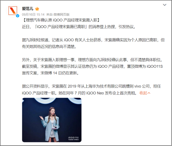近日,最美产品经理宋紫薇被曝离职iQOO,投入理想汽车的怀抱。