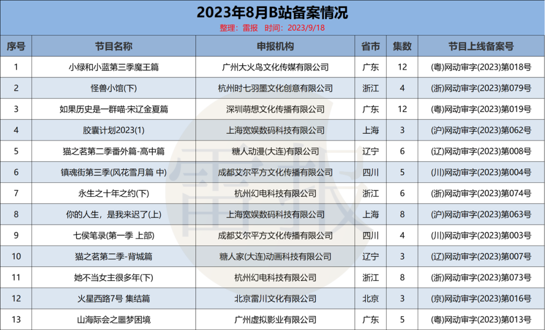 B站在8月通过上线备案的作品中占了13部,分别为《小绿和小蓝第三季魔王篇》《怪兽小馆(下)》《如果历史是一群喵·宋辽金夏篇》《胶囊计划2023(1)》《猫之茗第二季番外篇-高中篇》《镇魂街第三季(风花雪月篇 中)》《永生之十年之约(下)》《你的人生,是我来迟了(上)》《七侯笔录(第一季 上部)》《猫之茗第二季-背城篇》《她不当女主很多年(下)》《火星西路7号 集结篇》《山海际会之噩梦困境》。