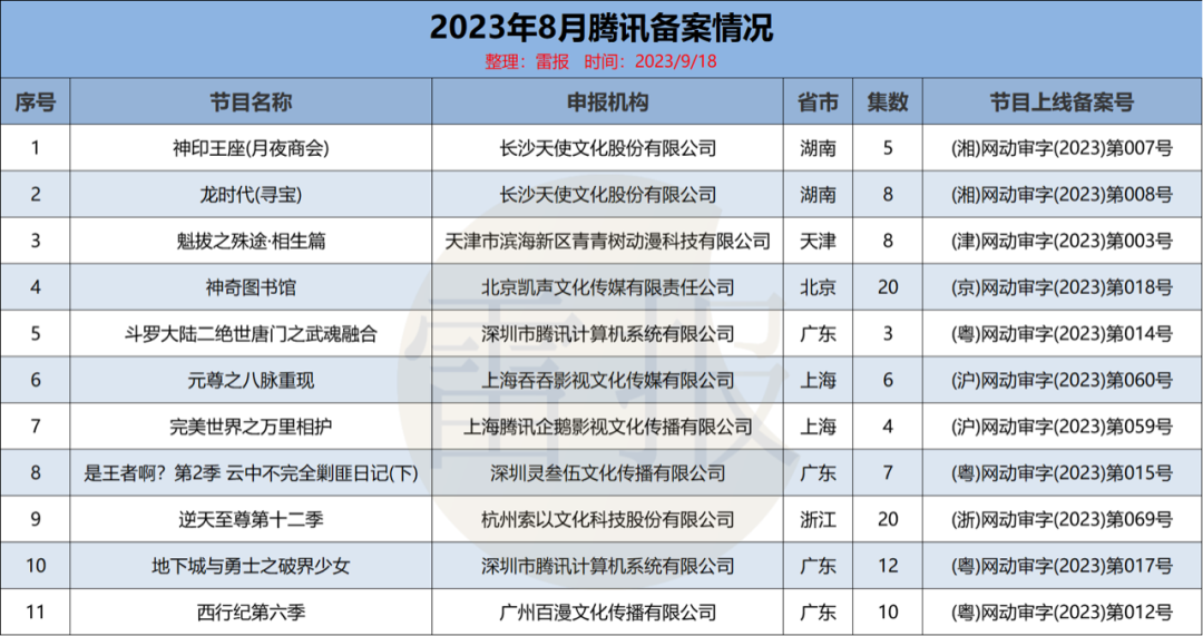 8月,腾讯通过上线备案作品共11部,分别为《神印王座(月夜商会)》《龙时代(寻宝)》《魁拔之殊途·相生篇》《神奇图书馆》《斗罗大陆二绝世唐门之武魂融合》《元尊之八脉重现》《完美世界之万里相护》《是王者啊?第2季 云中不完全剿匪日记(下)》《逆天至尊第十二季》《地下城与勇士之破界少女》《西行纪第六季》。