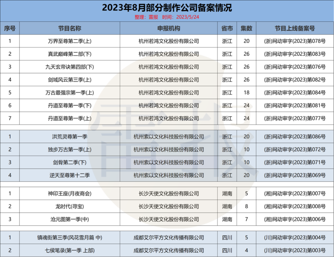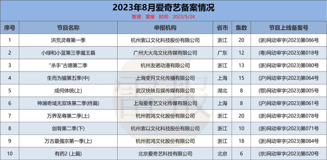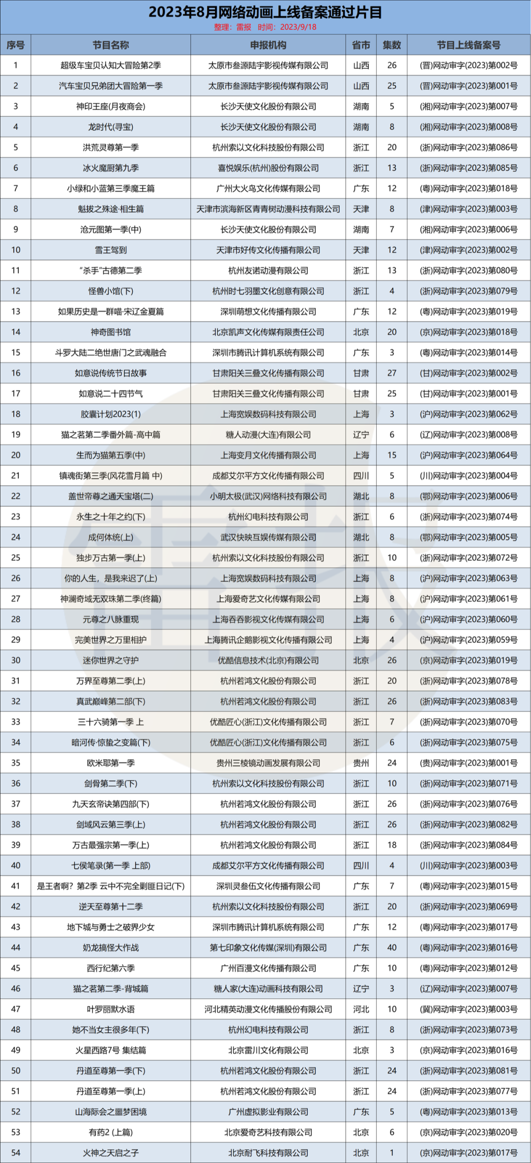 继今年1-7月221部网络动画完成上线备案后,近日,雷报通过整理和统计获悉,2023年8月上线登记通过备案的网络动画片共54部,总计693集。