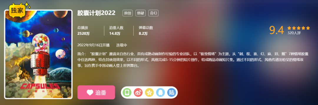《胶囊计划2023(1)》是哔哩哔哩扶持国产动画的特别项目之一《胶囊计划2022》的续作,据悉,《胶囊计划》邀请来自各行业、具有成熟动画制作经验的专业团队,以“极致情绪”为主题,并以不同的形式、风格完成5-15分钟的短片创作,组成精品动画短片集。目前,《胶囊计划2022》在B站有2520的总播放,14.8万的追番人数。