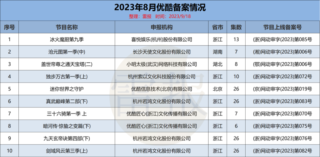 优酷通过上线备案作品10部,分别为《冰火魔厨第九季》《沧元图第一季(中)》《盖世帝尊之通天宝塔(二)》《独步万古第一季(上)》《迷你世界之守护》《真武巅峰第二部(下)》《三十六骑第一季 上》《暗河传·惊蛰之变篇(下)》《九天玄帝诀第四部(下)》《剑域风云第三季(上)》。