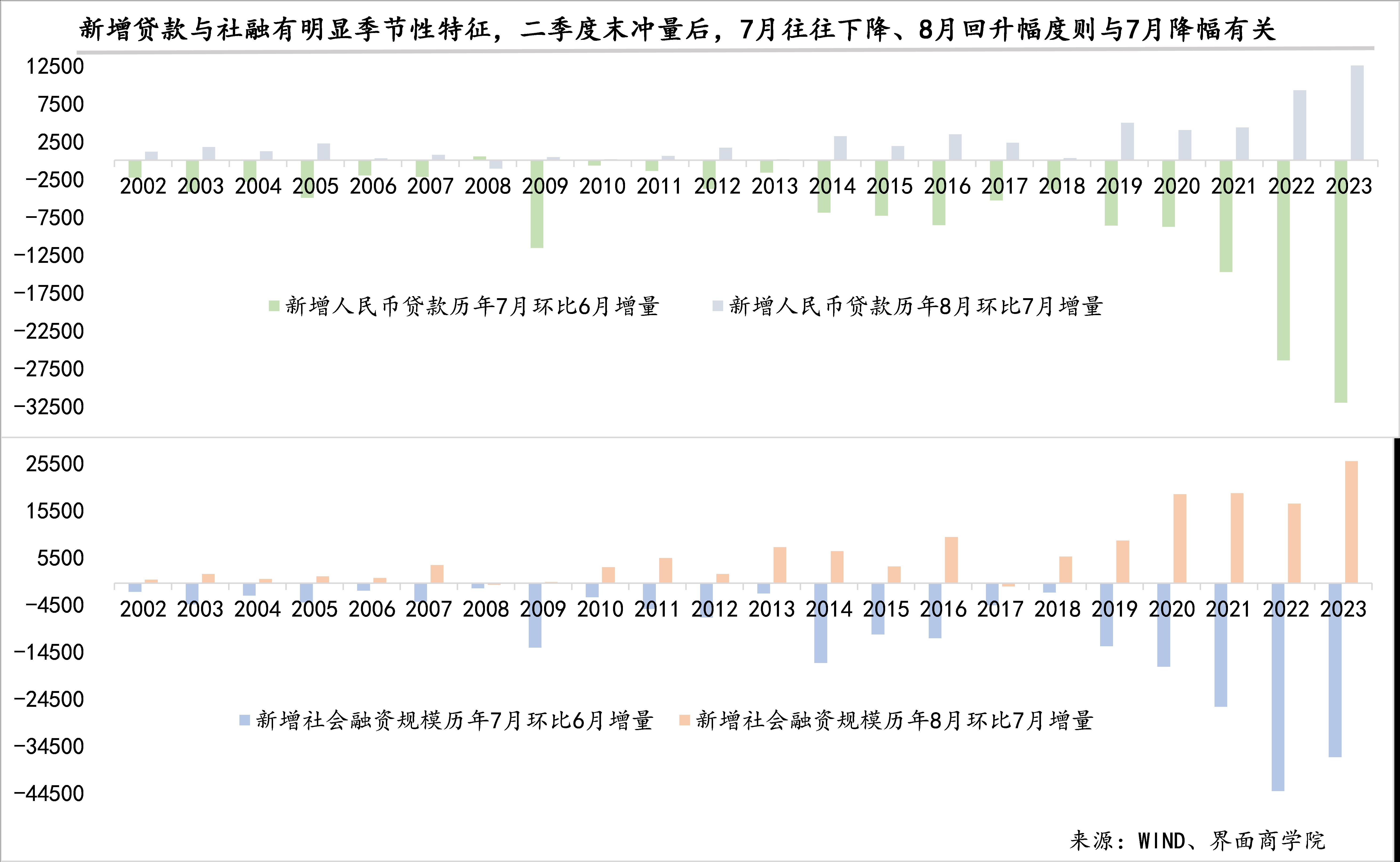 对于融资而言,因为季末考核的原因,由贷款在季末冲量引发的相关数据在月度之间波动较大(年底年初则往往会有不同表现),季度最后一个月往往大幅增长,季度第一个月往往会显著下降,季度第二个月上升。以社会融资规模与人民币贷款在二、三季度之交的变化为例,二者均在6月份季末冲量后,7月份新增量往往会较6月份有所减少,8月份新增量往往较7月份有所增加,后者增加的规模在一定程度上与7月份减少的规模有关。