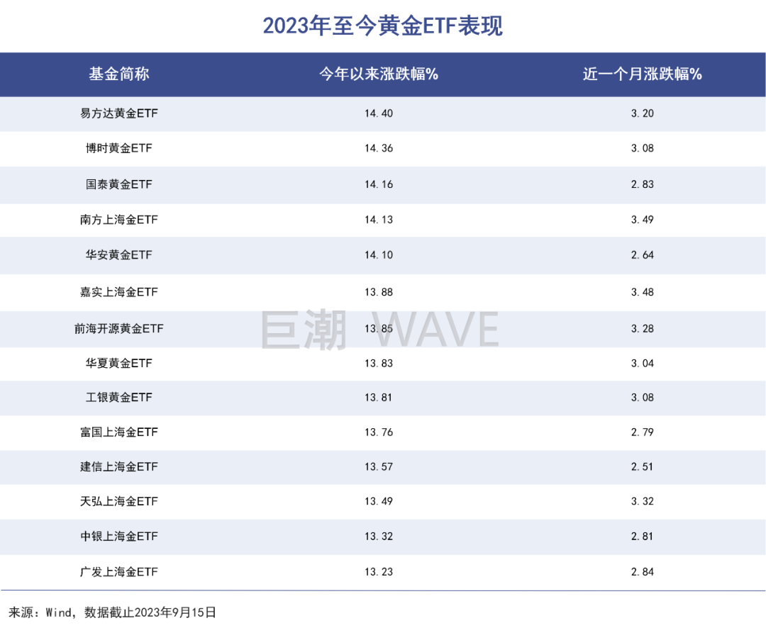 目前市场上有14只黄金主题ETF,主要通过投资黄金现货,跟踪国内黄金现货走势。截至9月15日,这些黄金ETF年内涨幅在13.23%-14.40%之间,整体收益率表现都不错。