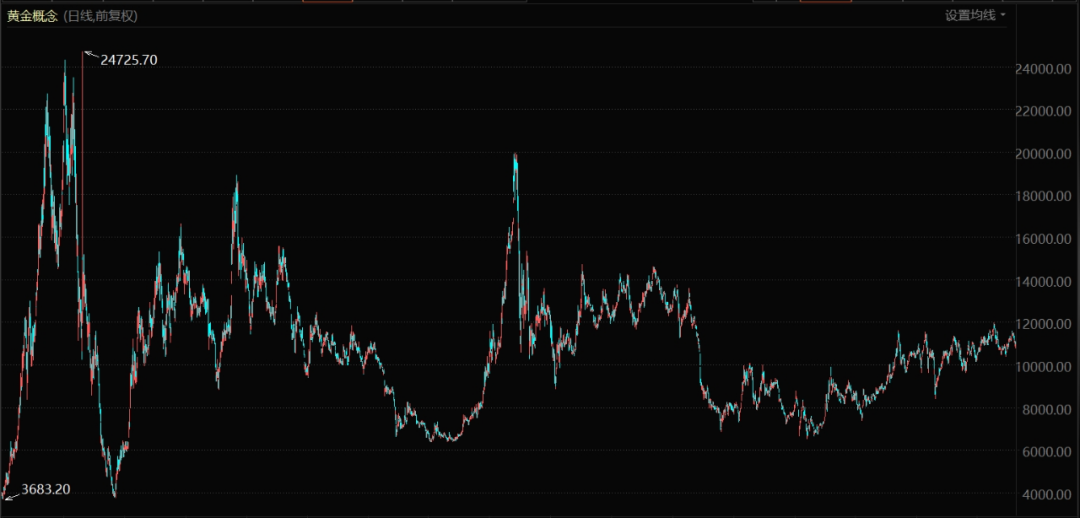 黄金概念指数的历史高点为2007年的24725.69和2015年的19730.71,这两个时间段既是中国股市的高峰,又值中国经济进入新的发展阶段,很难预测下一次出现这样的投资风口是会在猴年马月。
