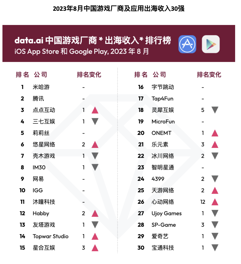 在本月早些时候,另一家第三方数据监测机构data.ai发布了8月中国游戏厂商及应用出海收入榜单(iOS App Store和Google Play,不包括中国公司的海外收购公司及中国公司通过海外代理发行App的收入),米哈游、腾讯和点点互动分别位列前三名。