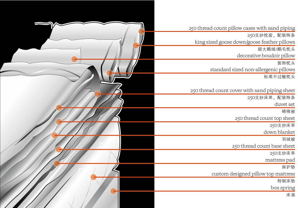 坚固稳定的床架,贴合承托的床垫和枕头,纯白的高支床品,松软的羽毛垫,温暖的羽绒被组成了MyBed™,为你带来法式奢华睡眠享受。