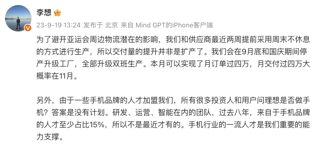 9月16日,理想汽车CEO李想在微博发文称,“由于一些手机品牌的人才加盟我们,所有很多投资人和用户问理想是否做手机?答案是没有计划。研发、运营、智能在内的团队,过去八年,来自于手机品牌的人才至少占比15%,所以不是最近才有的。手机行业的一流人才是我们重要的能力支撑。”