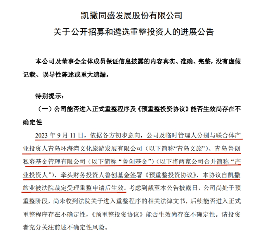公开招募和遴选重整投资人新进展:2023年9月11日,在与原中选产业投资人三亚旅文集团磋商过程中,因情势变更等情况各方未能就协议内容完全达成一致,临时管理人依规递补联合体投资人青岛文旅、鲁创基金为中选产业投资人。依据各方初步意向,凯撒旅业及临时管理人分别与联合体产业投资人青岛文旅、鲁创基金,牵头财务投资人鲁创基金签署《预重整投资协议》。