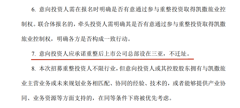 海南省显然舍不得放手凯撒旅业这个“壳”资源。7月3日发布的《关于公开招募和遴选重整投资人的公告》中对意向投资人有一项比较特殊的要求,即意向投资人应承诺重整后上市公司总部设在三亚,不迁址。