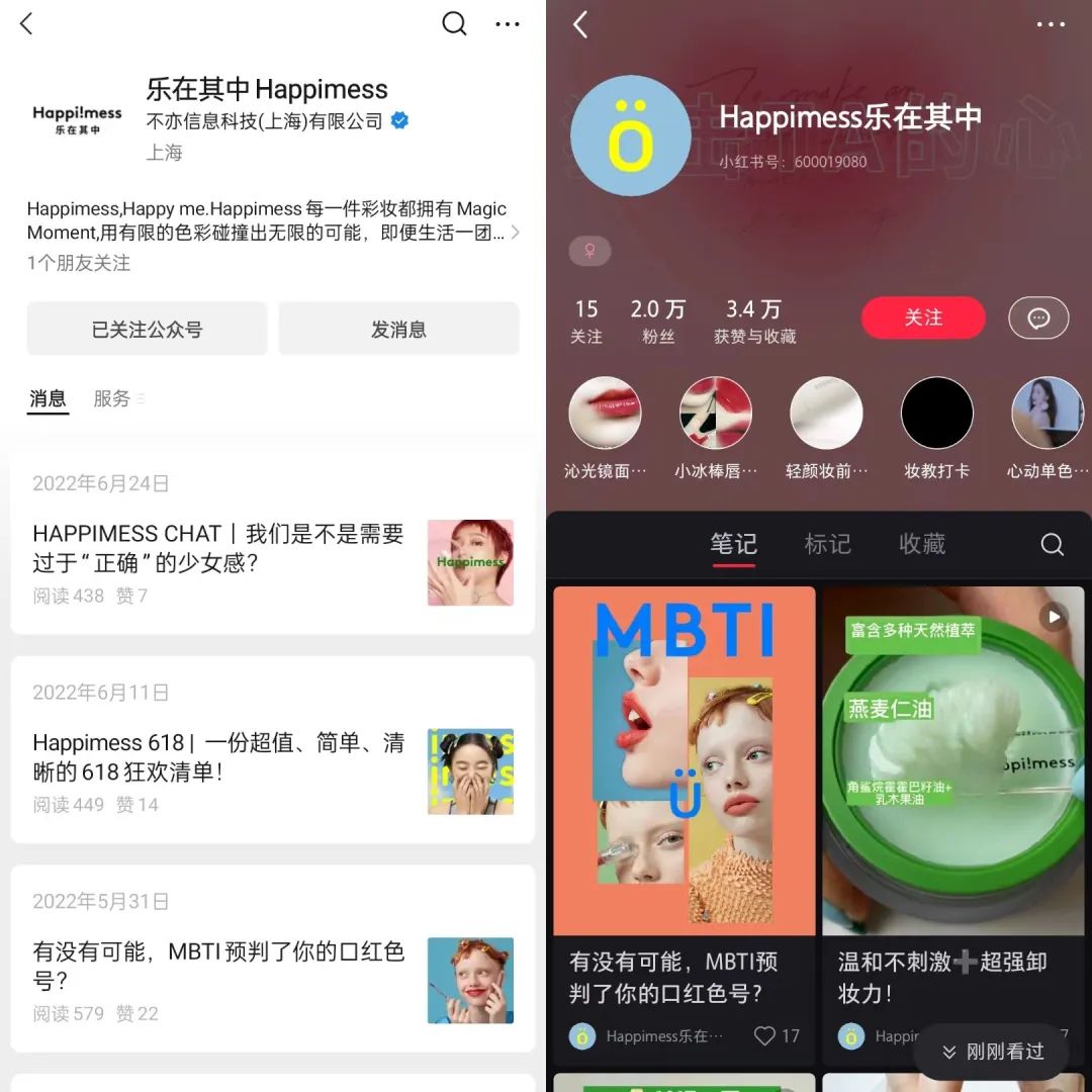仪美尚搜索发现,其官方微博已经于2022年2月暂停了更新。小红书官方账号最后一条内容则停留在了去年5月31日,官方微信公众号也于同年次月停更。另据国家药监局备案信息平台,Happimess乐在其中相关产品的最新备案时间显示为2021年10月。