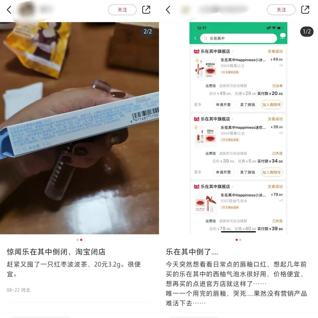 目前小红书上,“乐在其中倒闭”相关内容居于搜索栏首位。不过,其品牌小红书官方账号内笔记链接的唇釉商品仍在售卖。该唇釉也是其店内在售的产品之一,到手价约为35元,已售超200件。