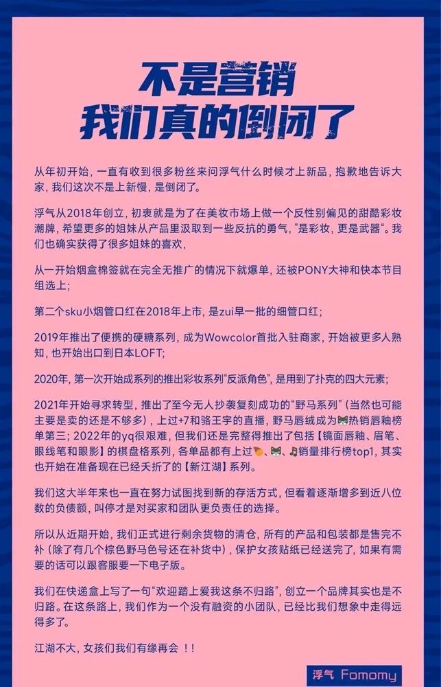 需要关注的是,这已经是近半月来,第3家官宣闭店的新锐美妆品牌。此前分别是新锐彩妆品牌浮气Fomomy和新锐香氛品牌Scentooze三兔。