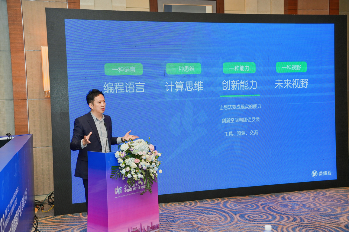 在《培养人工智能时代下的科技少年》主题演讲中,猿编程创始人李翊分享了公司人工智能教育的品牌定位以及具体的产品研发实践。其教育产品体系围绕“四个一”培养模型,即“编程语言、计算思维、创造能力、未来视野”,持续探索人工智能科技与核心素养的深度融合和教育创新。