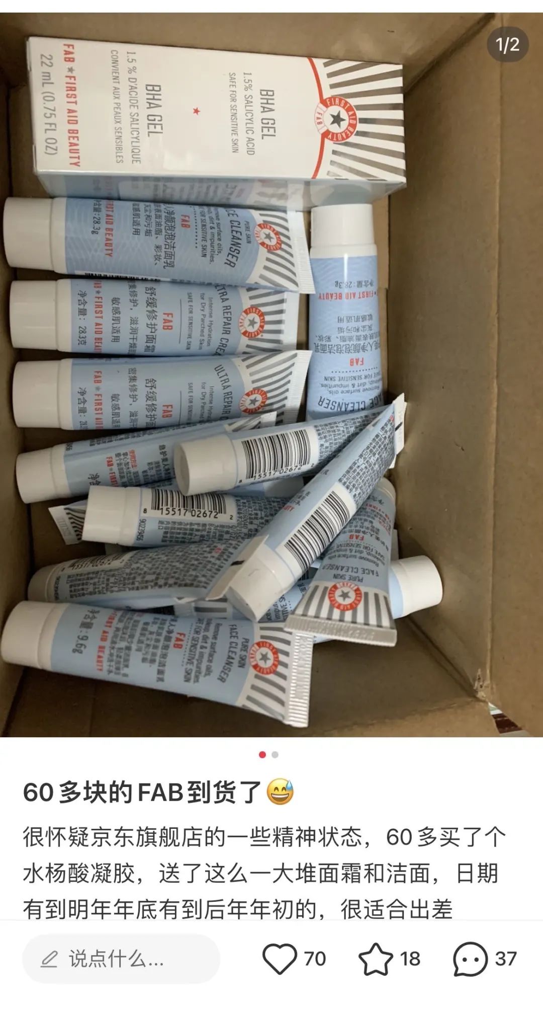 例如,其官方旗舰店原价269元/170g的“急救修护面霜”,在天猫国际自营上折后价仅为139元,在某海淘店定价甚至低至50元,此举导致消费者质疑其价格体系不稳。还有网友表示,自己花120元买到了20多件FAB产品,包括面霜、洗面奶、精华水等品类,既有正品也有中样,也被怀疑有“捆绑销售”之嫌。合算下来,面霜价格低至谷底,“十几二十块钱一罐面霜,FAB这个价格是认真的吗?”