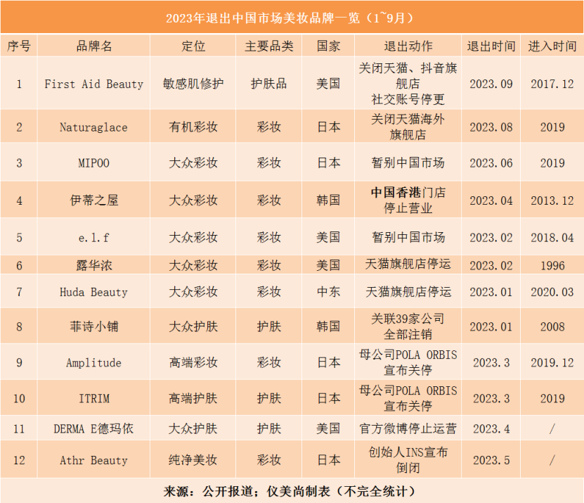 据仪美尚不完全统计,仅今年1至9月,就至少有10余个外资品牌撤出中国市场,其中不乏在中国已经小有名气的品牌,如上述FAB,以及e.l.f.、Huda Beauty、菲诗小铺、露华浓等。