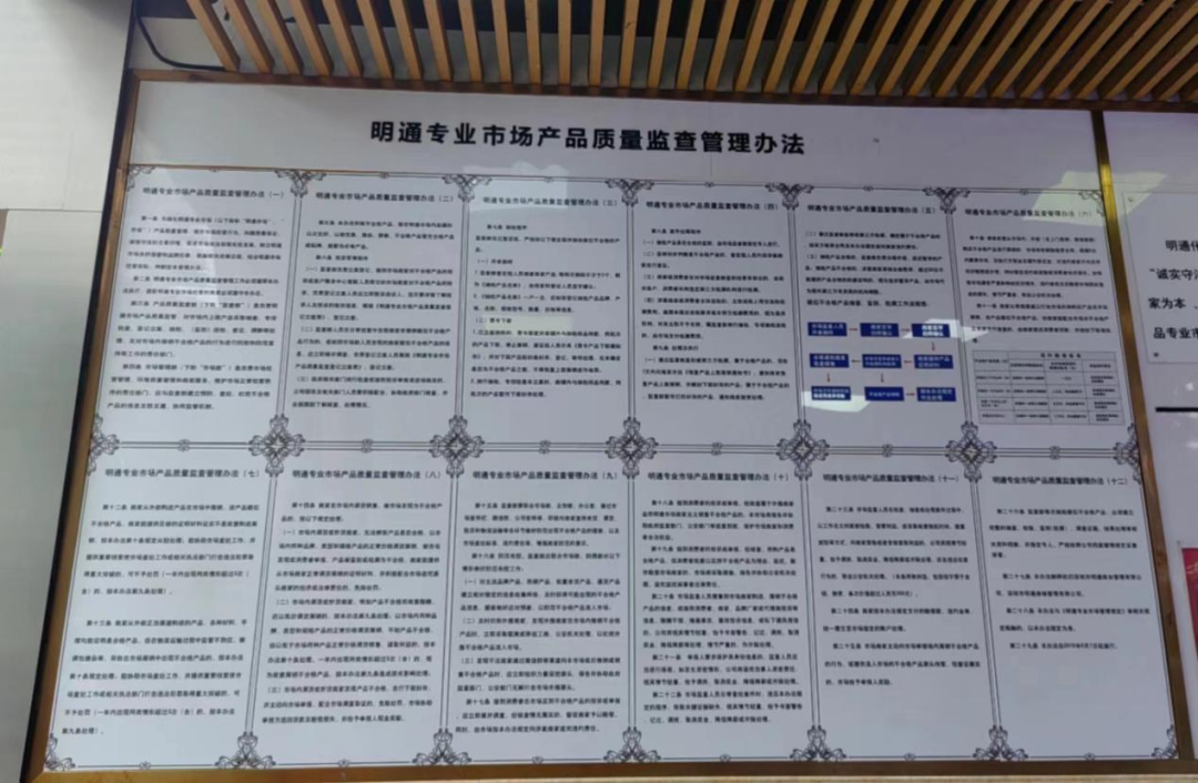 在明通市场的大门处,有一面大墙张贴了《明通专业市场产品质量监查管理办法》,对以次充好、以假充真、掺杂掺假产品予以严厉的打击和惩罚。