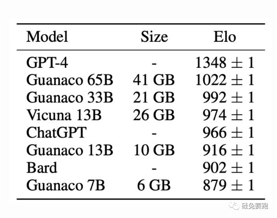 以下是根据Guanaco论文中报告的数据,该数据对比了Guanaco 7B与ChatGPT GPT-3.5和GPT-4的性能。